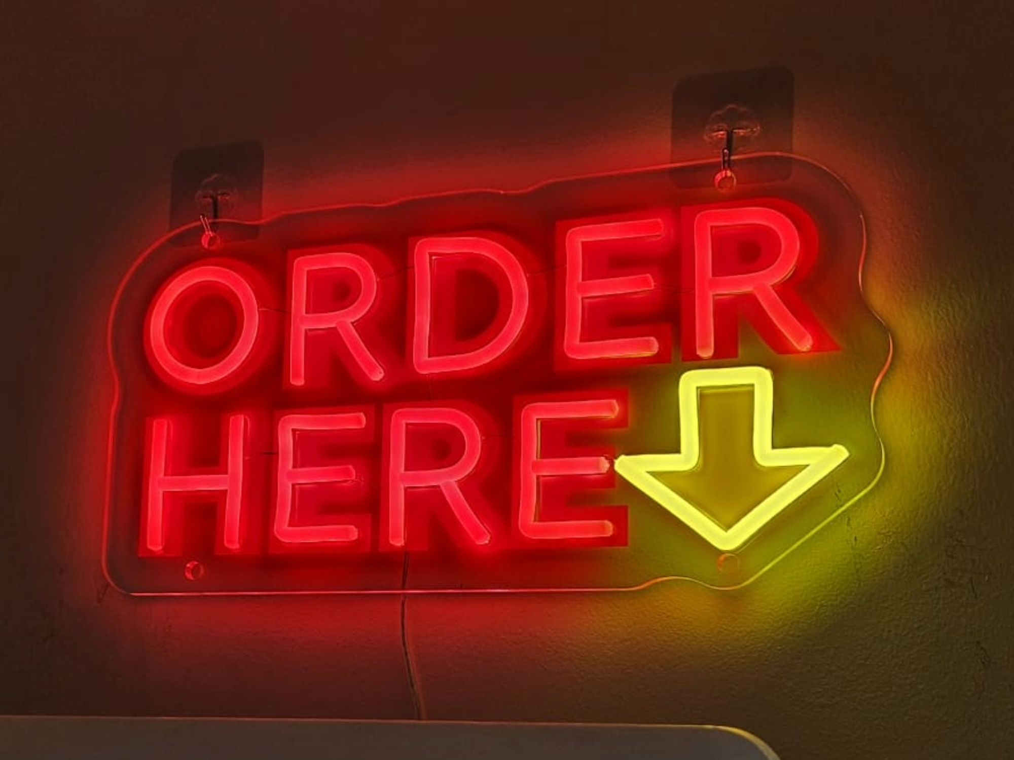 Neon 'Order Here' Sign Can be wall mounted or slots directly into top of Kiosk Pro. Comes with remote controller and all screws/fittings.